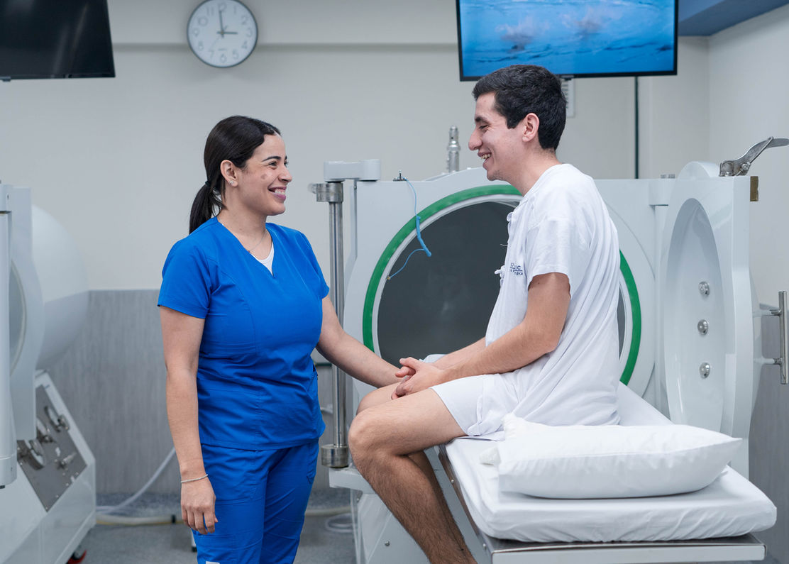 Al ingreso en la cámara los pacientes deben usar ropa 100% de algodón, sin joyería ni otro